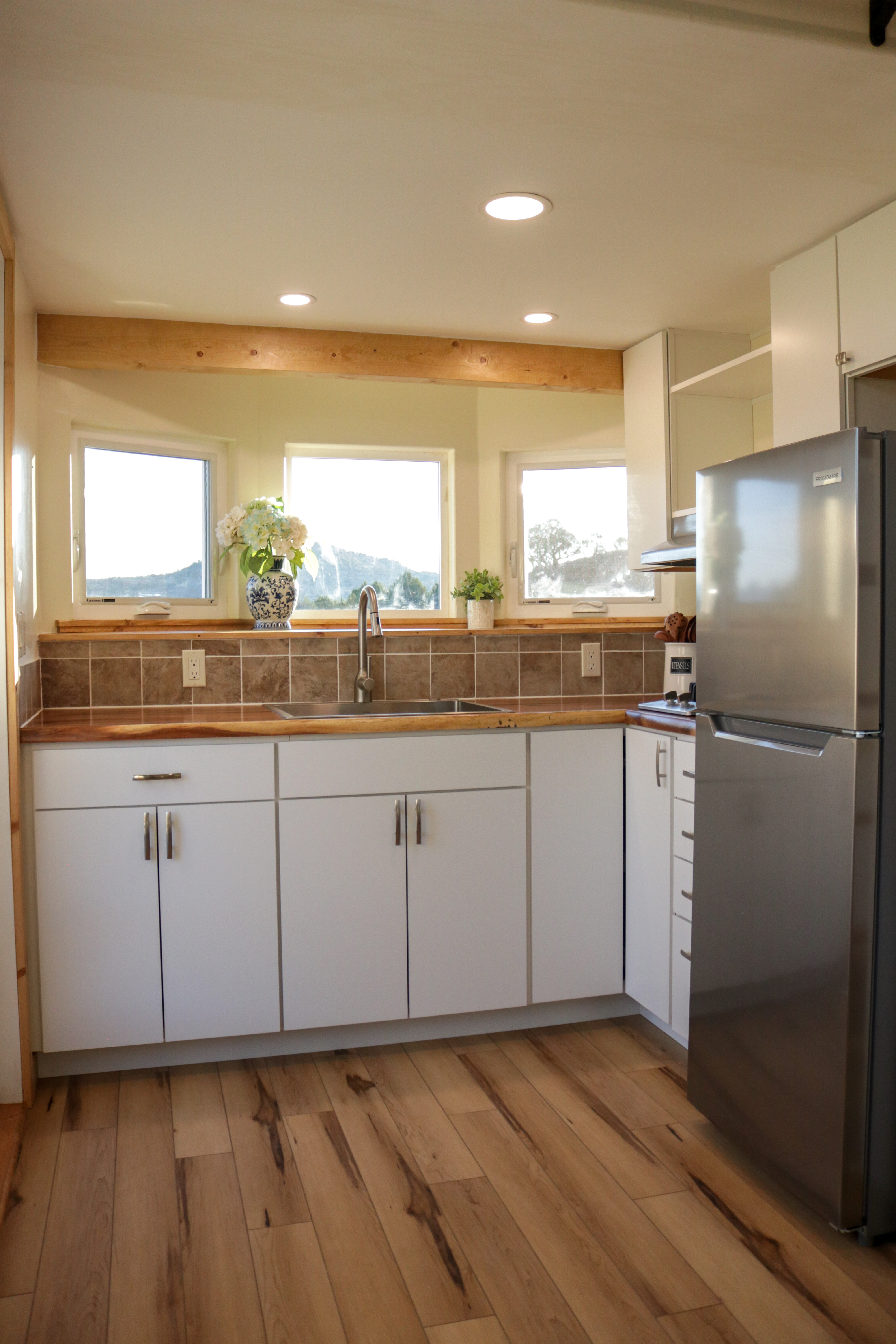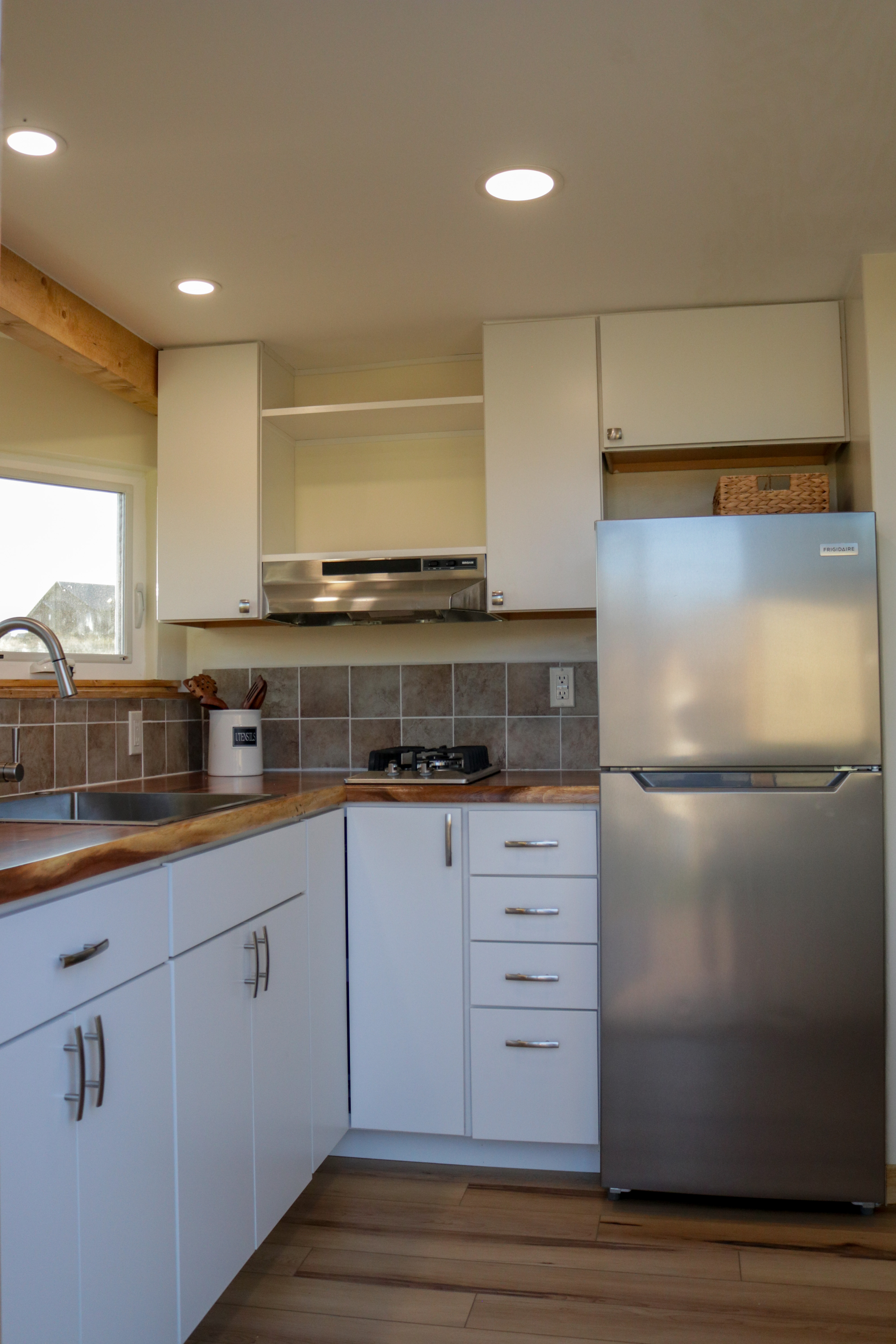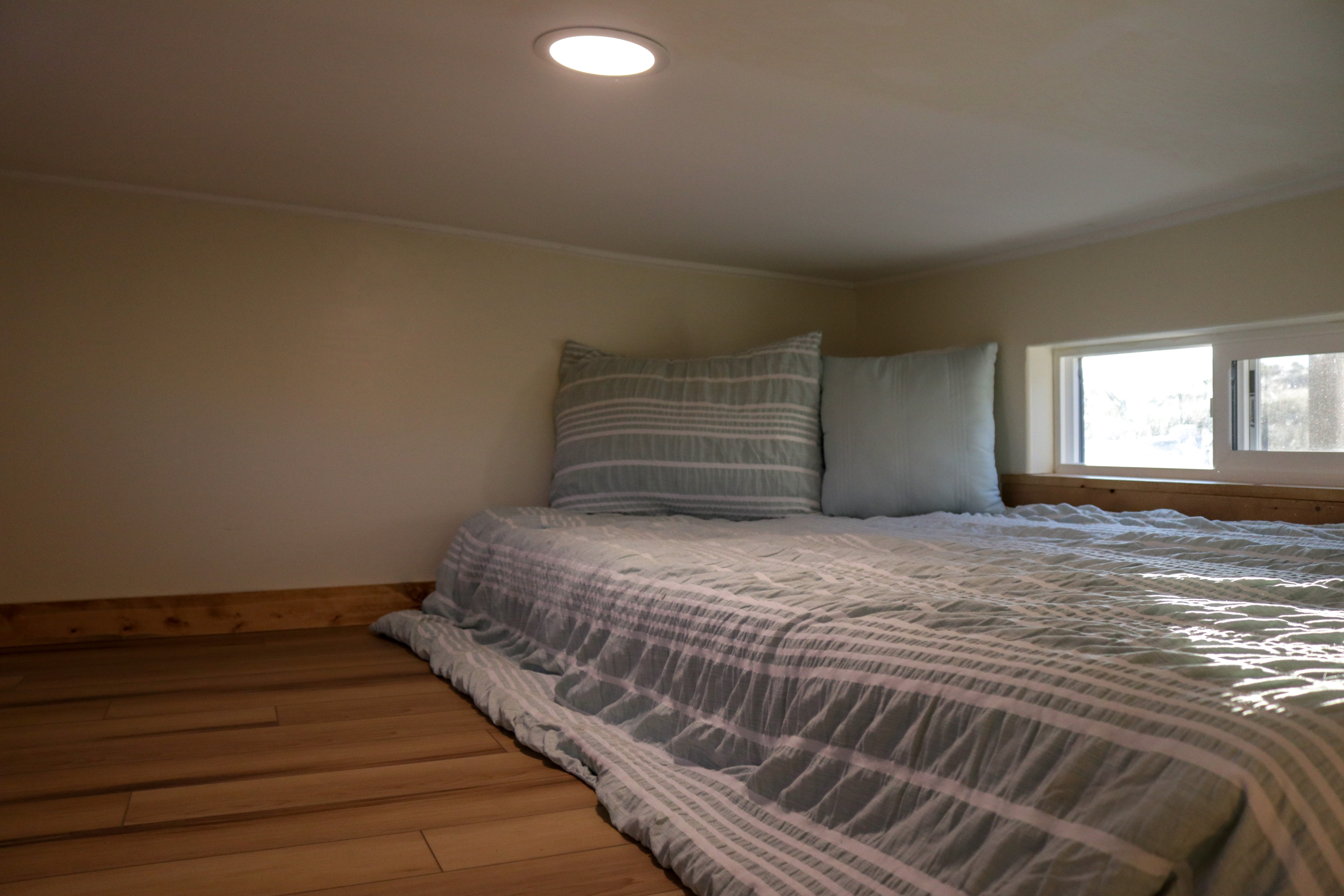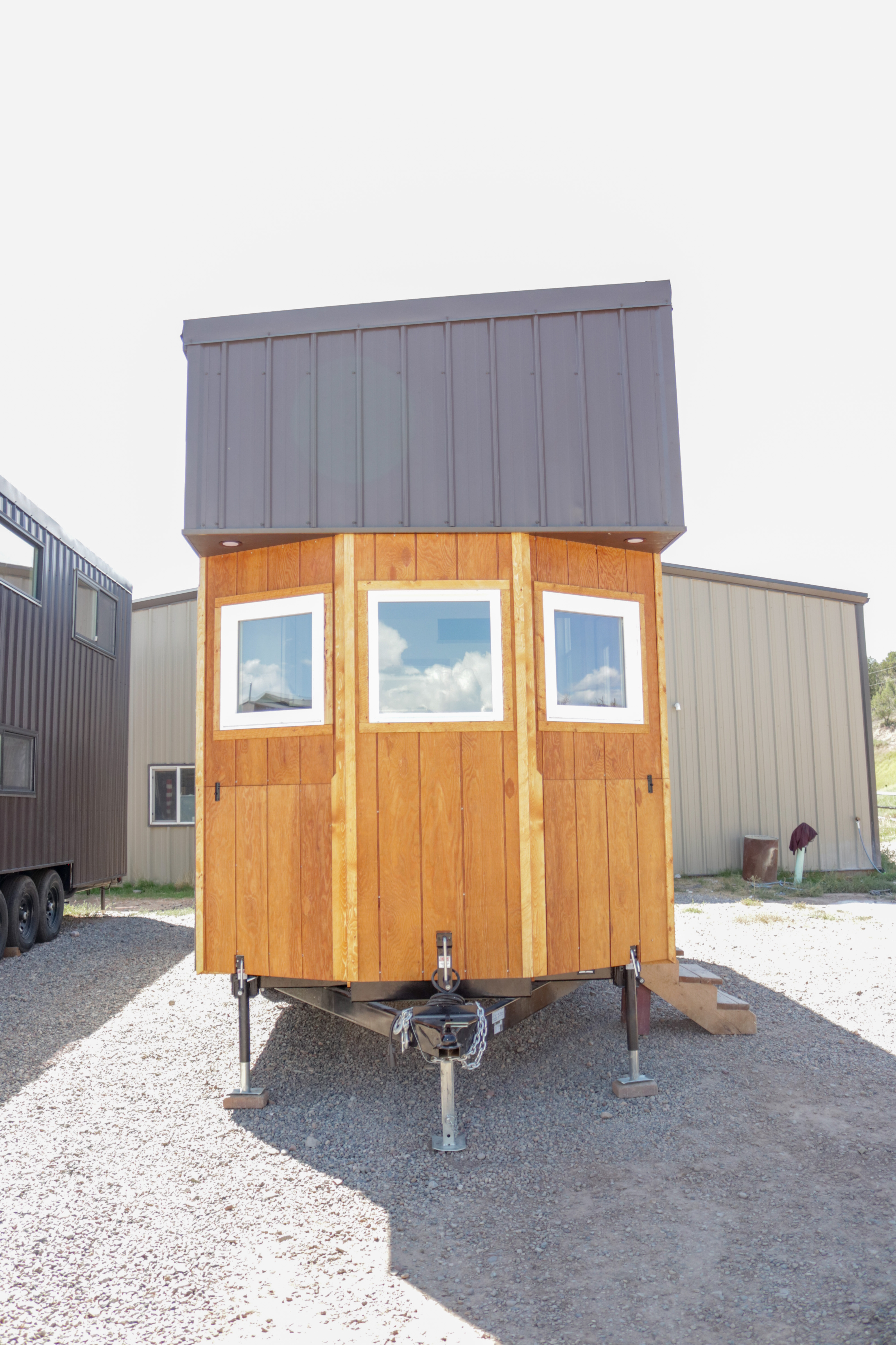 The Agatha tiny home is a one level tiny home with lofts. The main level features a full bathroom with a walk-in shower, a full kitchen with a bay window, and a stunning living room with a fireplace, vaulted ceilings. The home includes multiple windows (including 2 large 5-foot-wide windows) and an optional sliding glass door to welcome in the natural light. As with all of our models, everything can be customized to suite your specific needs.
