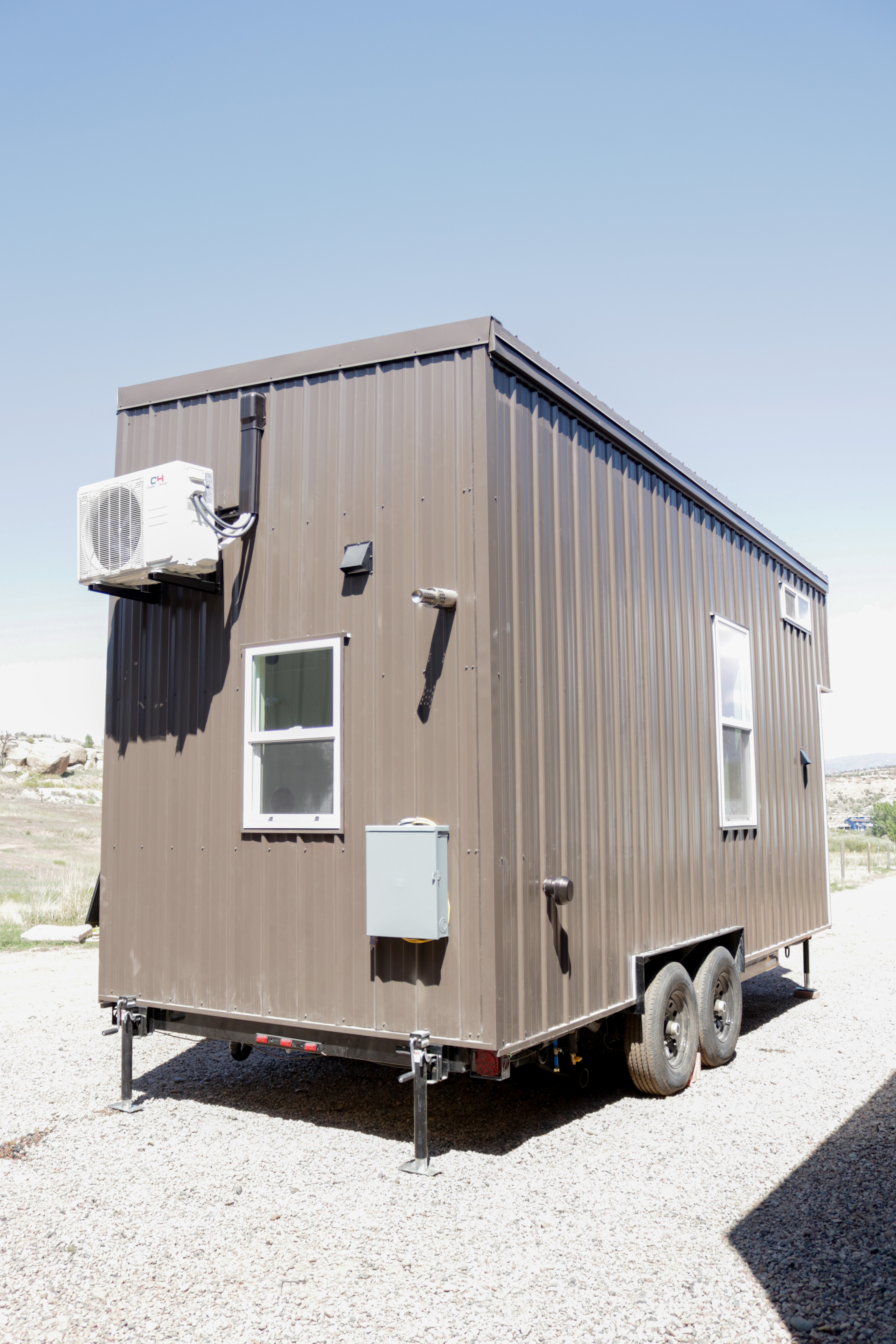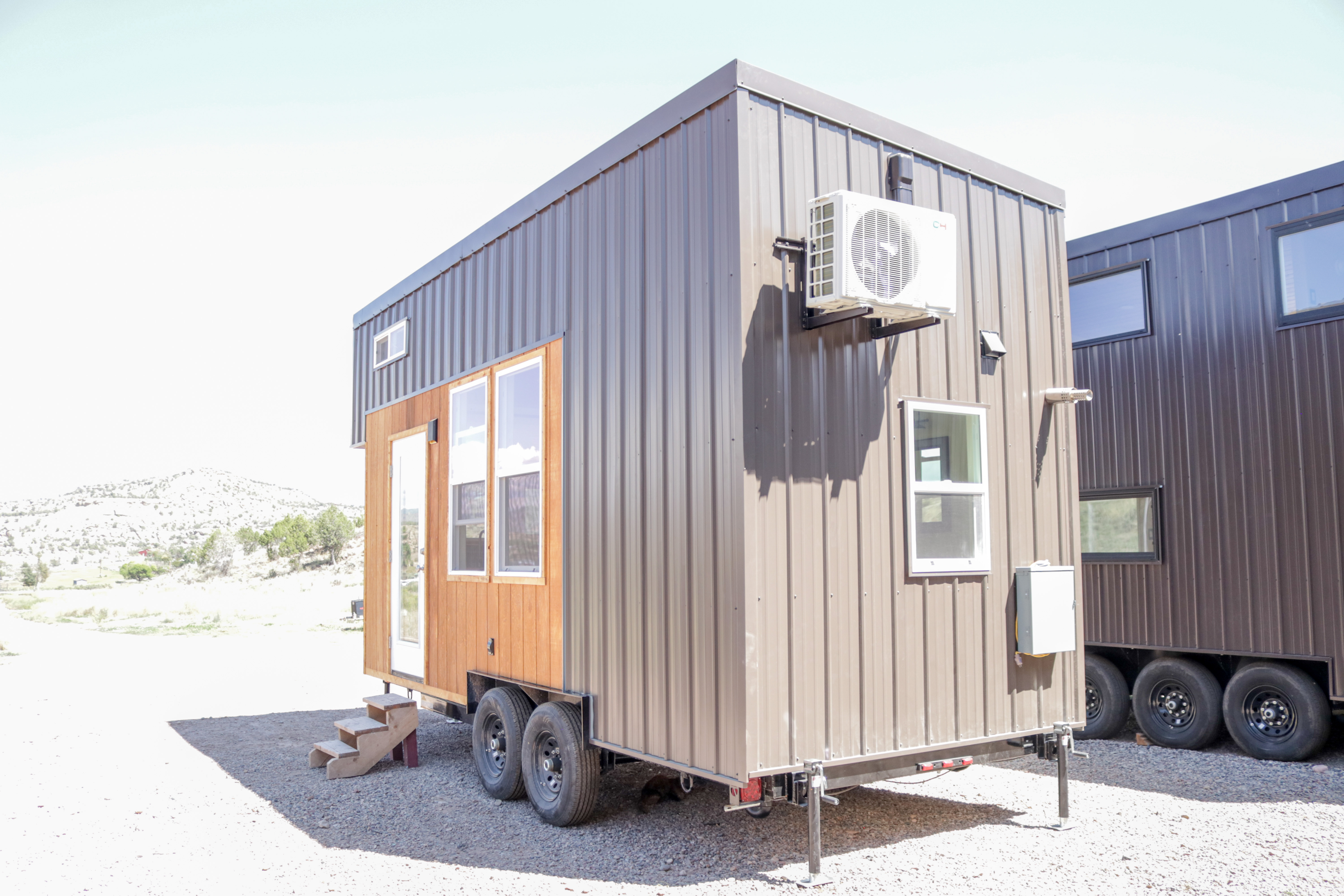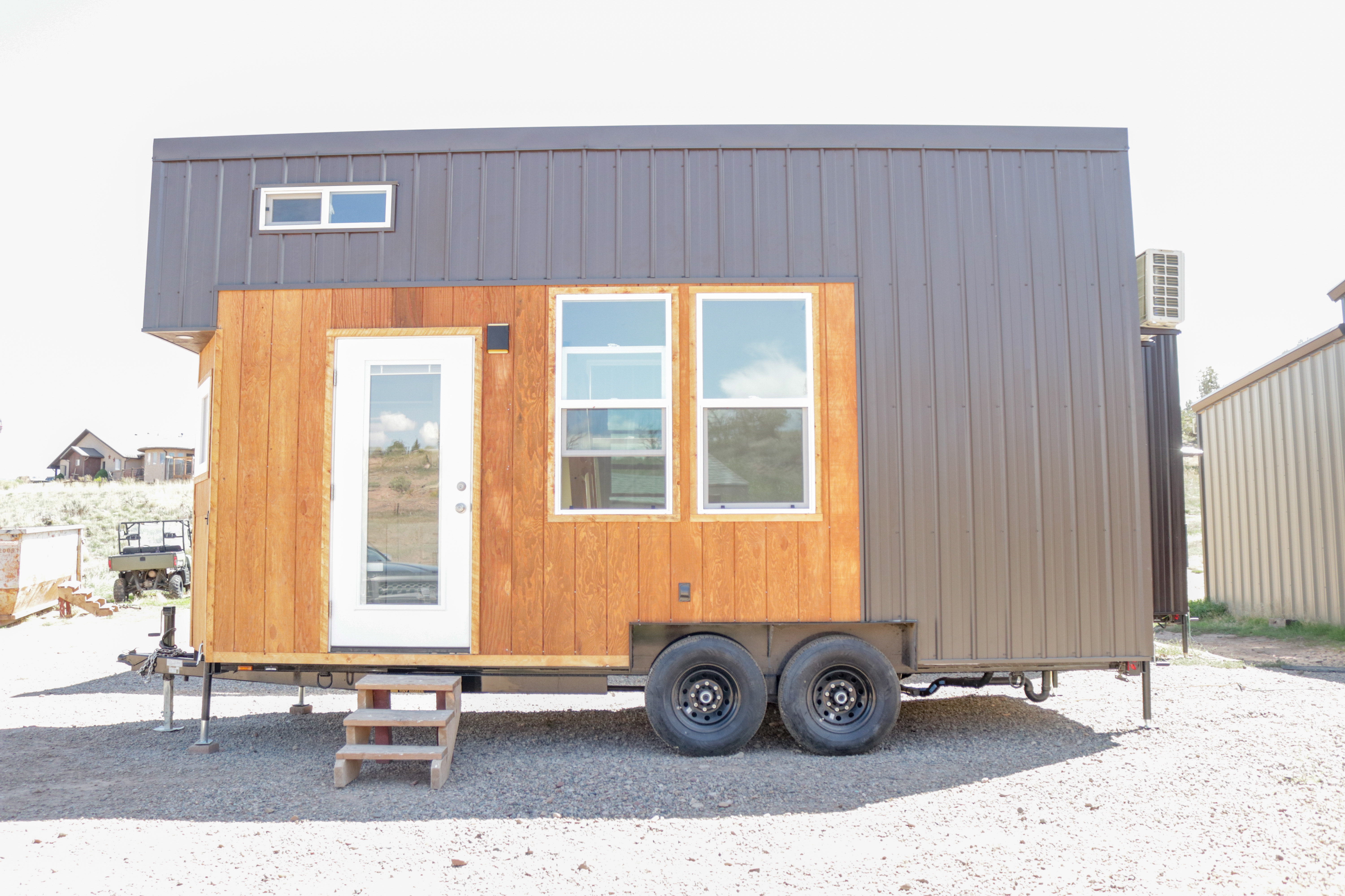 The Agatha tiny home is a one level tiny home with lofts. The main level features a full bathroom with a walk-in shower, a full kitchen with a bay window, and a stunning living room with a fireplace, vaulted ceilings. The home includes multiple windows (including 2 large 5-foot-wide windows) and an optional sliding glass door to welcome in the natural light. As with all of our models, everything can be customized to suite your specific needs.