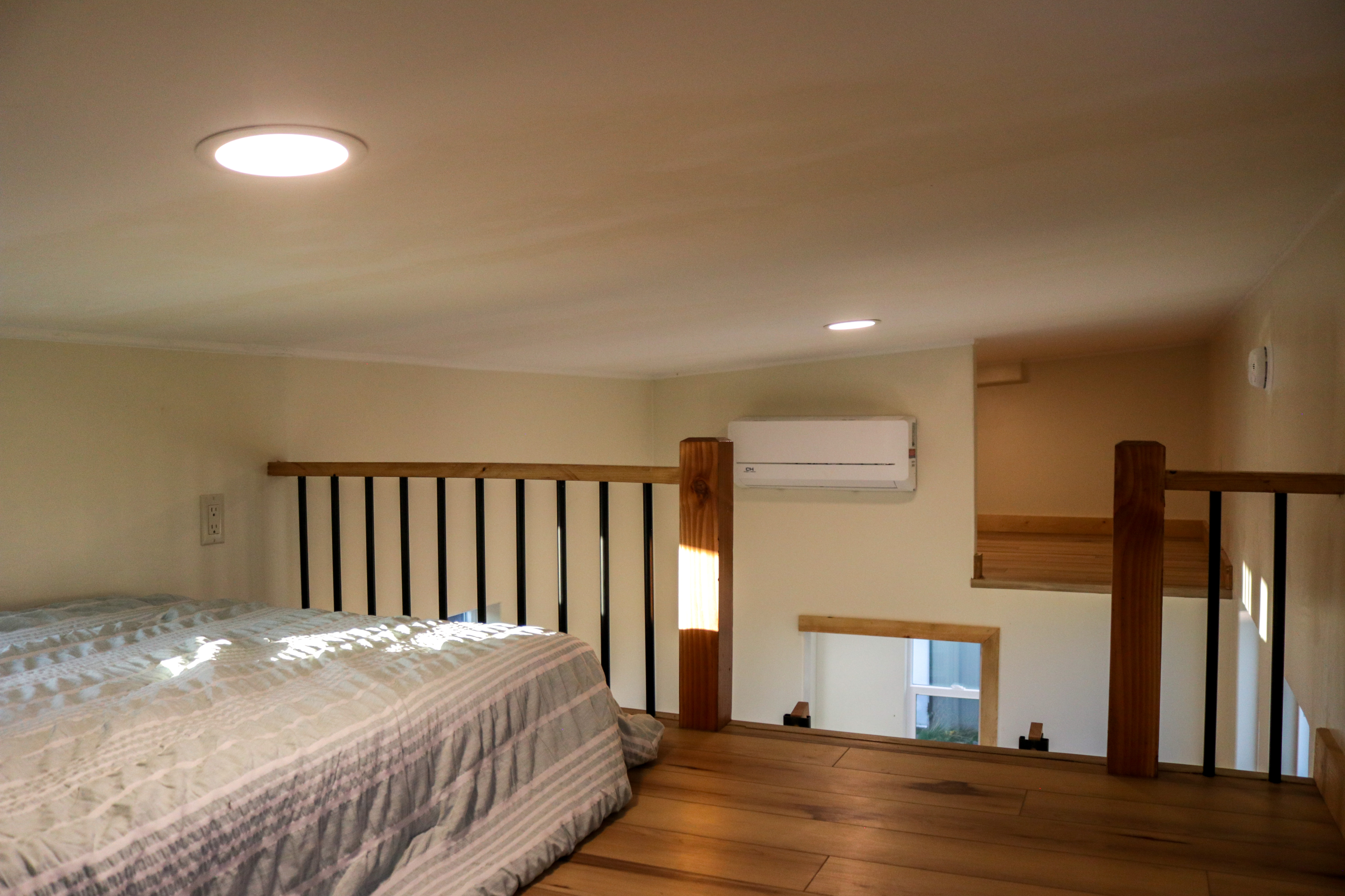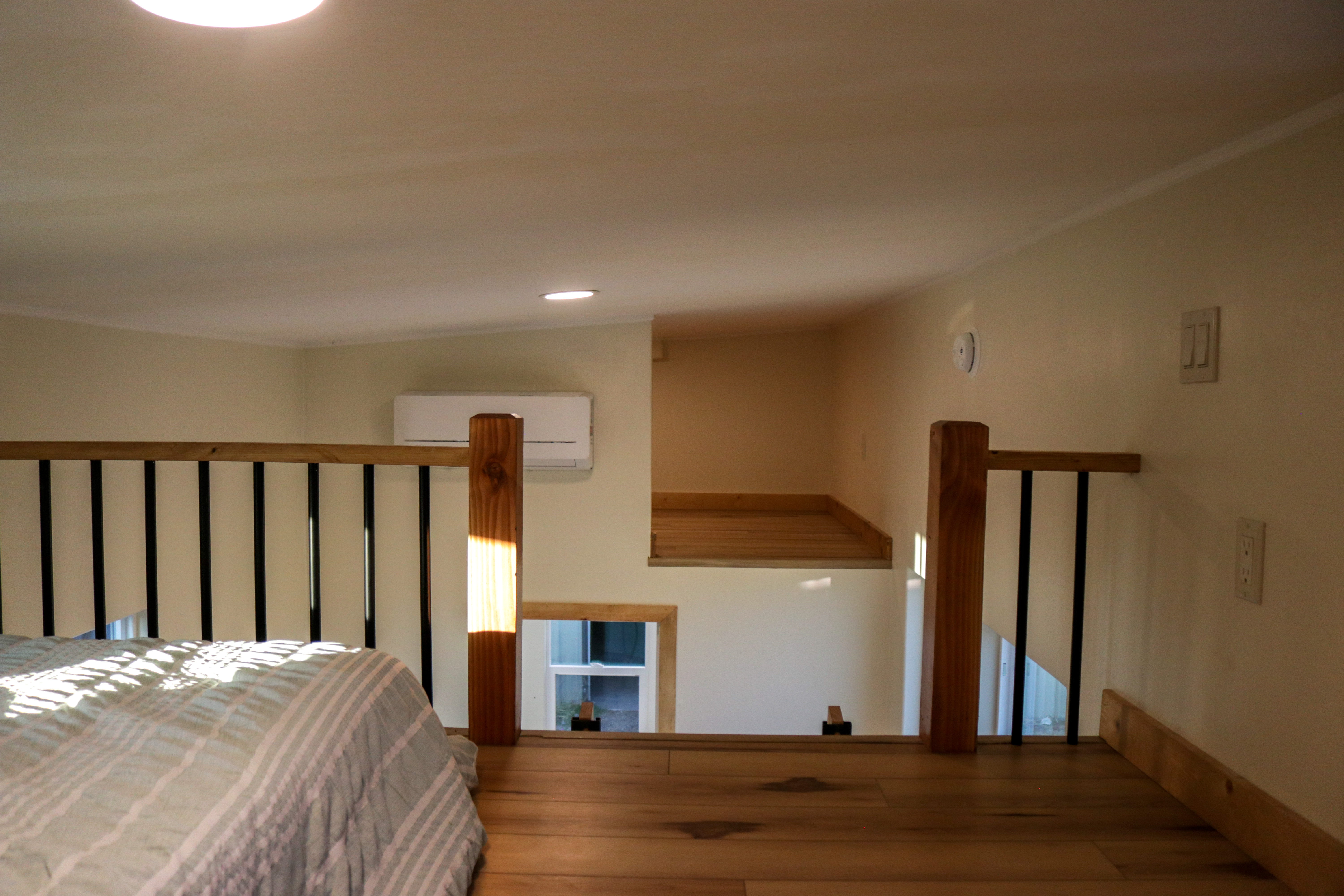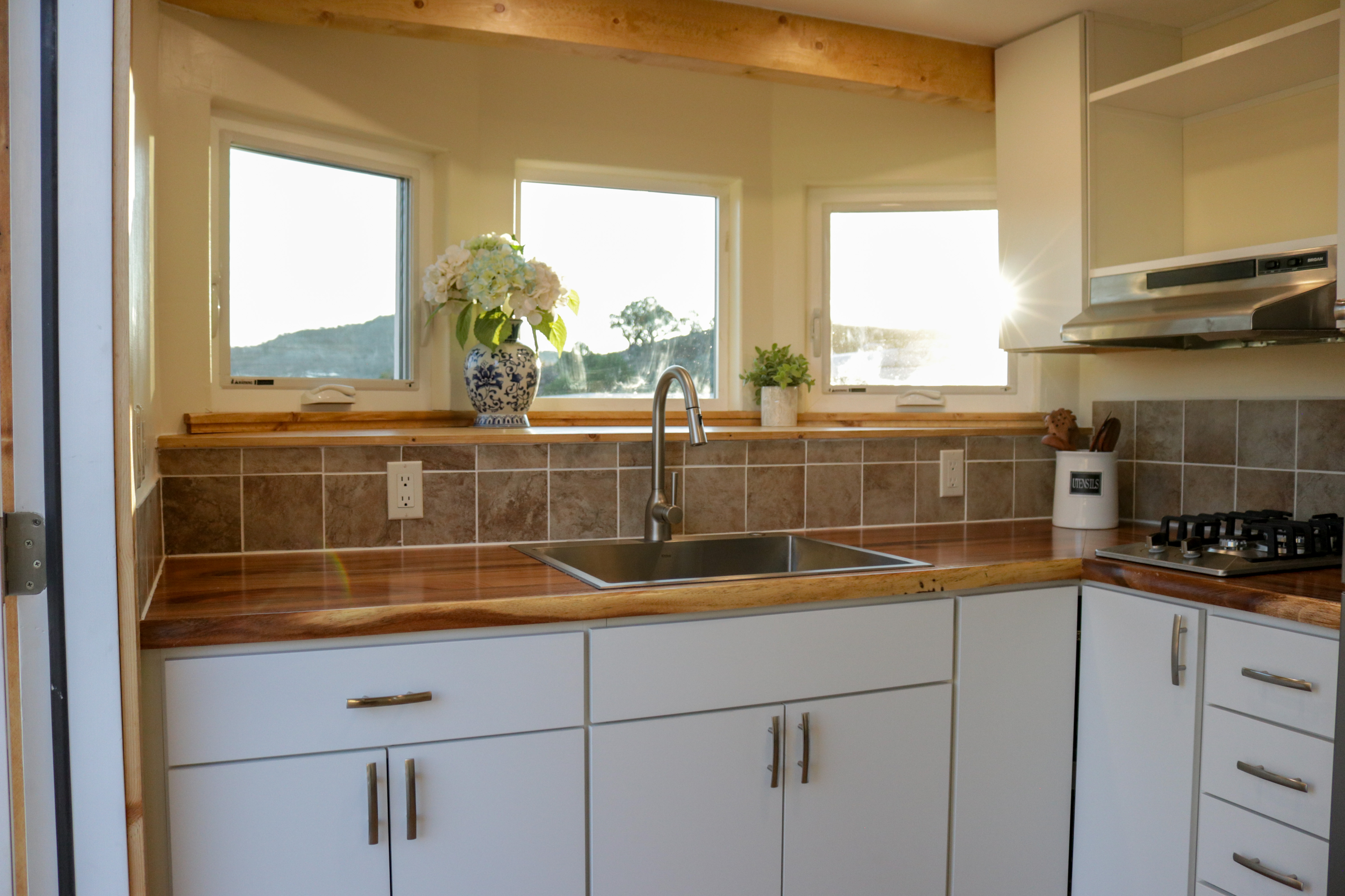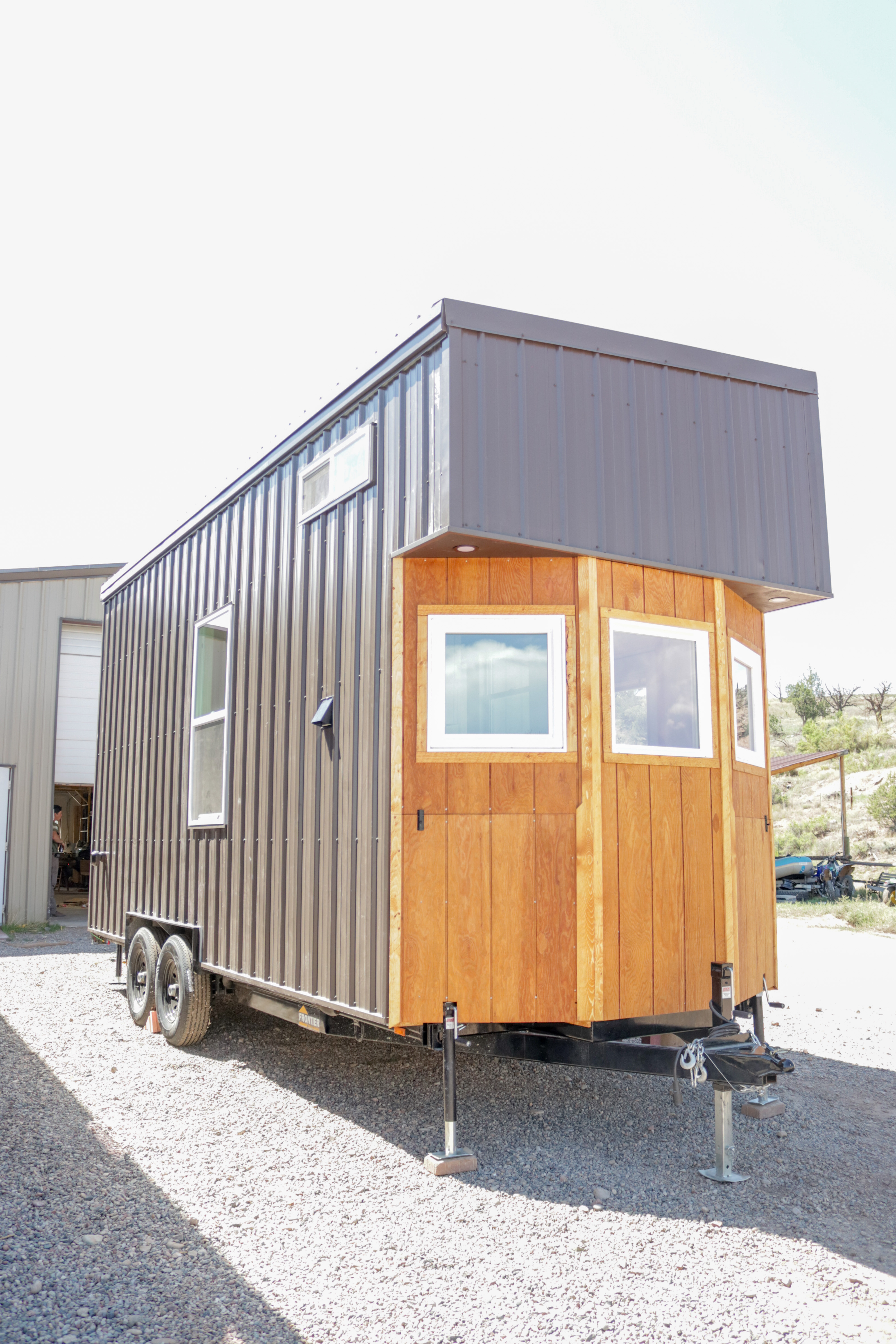 The Agatha tiny home is a one level tiny home with lofts. The main level features a full bathroom with a walk-in shower, a full kitchen with a bay window, and a stunning living room with a fireplace, vaulted ceilings. The home includes multiple windows (including 2 large 5-foot-wide windows) and an optional sliding glass door to welcome in the natural light. As with all of our models, everything can be customized to suite your specific needs.