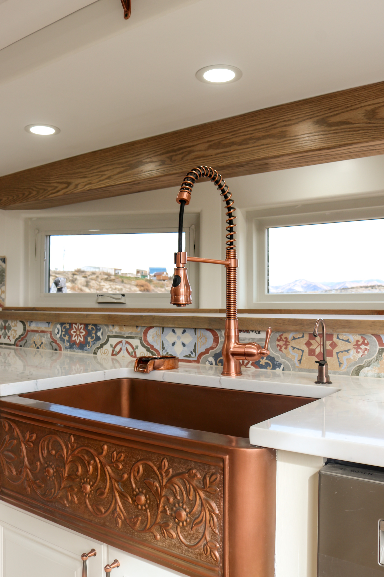 Aged patina copper farmhouse sink with elaborate floral pattern.