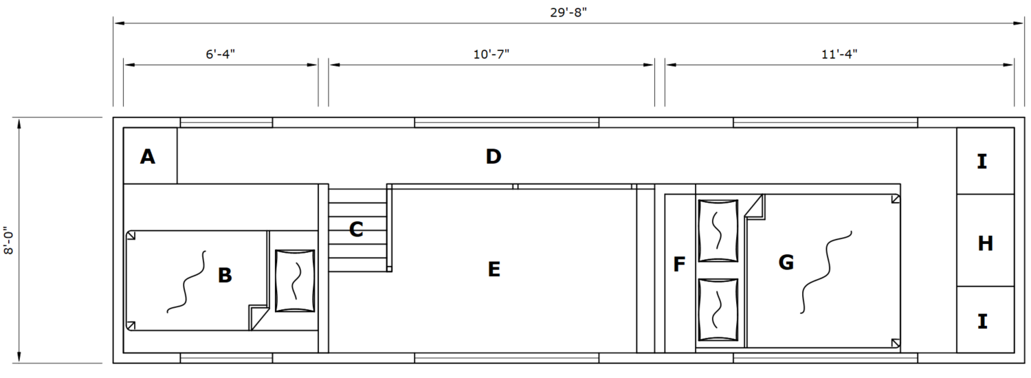The Felicity is our original two-story tiny home with two bedrooms on the upper level with a walkway in between. The main level features a full bathroom with a bathtub or walk-in shower, a full kitchen with a bay window and a large pantry, and a stunning living room with a fireplace, vaulted ceilings.